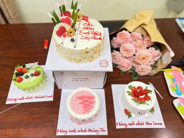 Bốn chiếc bánh kem xinh xắn, mỗi chiếc mang một thông điệp và hương vị riêng, tượng trưng cho những cá tính độc đáo của bốn người đã được chuẩn bị vô cùng chu đáo. Đây cũng là lời cảm ơn chân thành từ công ty vì những cống hiến không ngừng nghỉ của mọi người.
