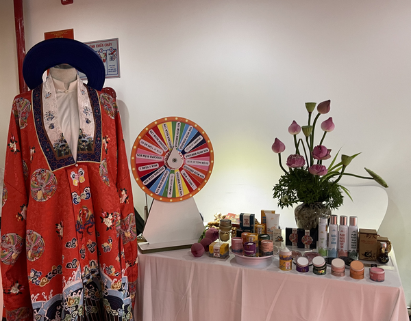 Gian hàng của Phấn Nụ Hoàng Cung tại sự kiện được chuẩn bị với tâm thế “kể chuyện bằng mọi chi tiết”. Trên chiếc bàn trưng bày ấy, hoa sen, nghệ, gừng được decor như những lát cắt của đất Việt: mộc mạc, tinh khiết và gần gũi. Bên cạnh đó, bộ áo dài Nhật Bình được trưng bày trang trọng thu hút nhiều ánh nhìn, như một cầu nối giữa mỹ phẩm cung đình và thời trang di sản.