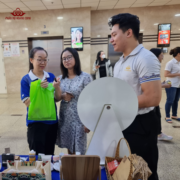 Từ sáng sớm, đội ngũ Phấn Nụ Hoàng Cung đã có mặt để chuẩn bị gian hàng. Không gian được set-up gọn gàng, tinh tế, nhẹ nhàng và gần gũi, tạo cảm giác thân thiện cho bất kỳ ai ghé qua. Nhiều bạn sinh viên tò mò dừng chân, lắng nghe câu chuyện hơn 80 năm gìn giữ di sản làm đẹp của thương hiệu.