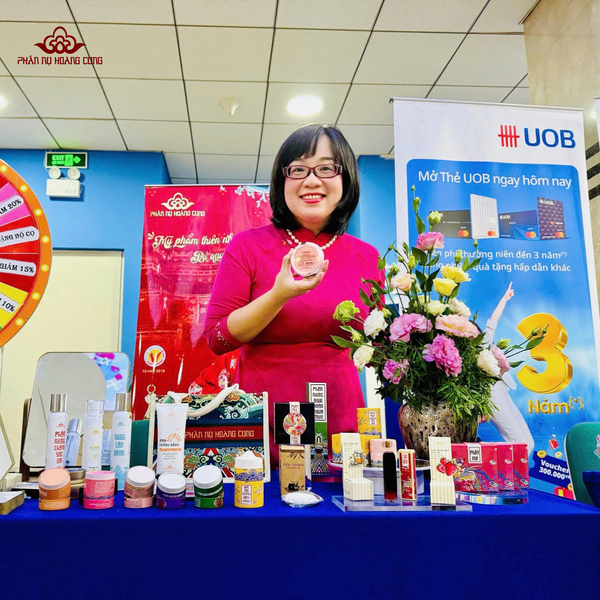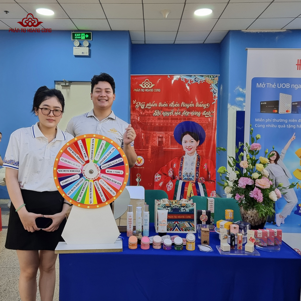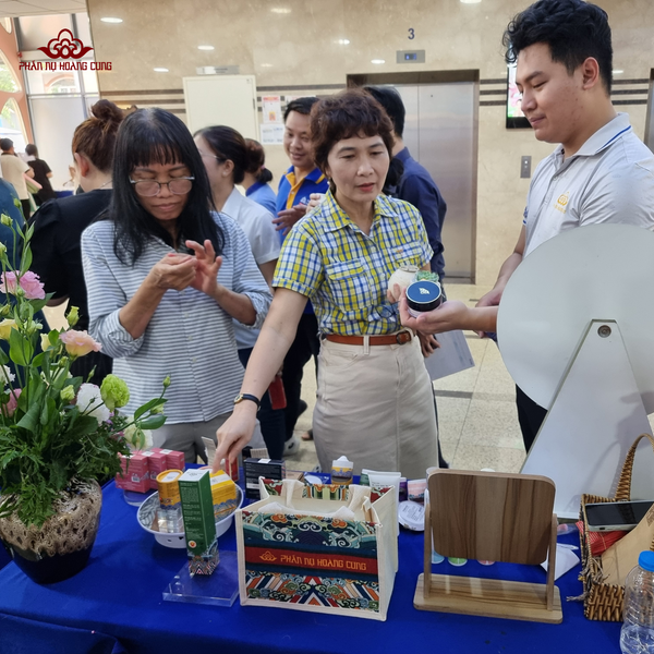 Đặc biệt, tại gian hàng, chị Nguyễn Phương Khanh – Chủ tịch Công ty TNHH Mỹ Phẩm Hoàng Cung – đã trực tiếp tư vấn, giới thiệu sản phẩm cho các quý thầy cô và các bạn sinh viên.