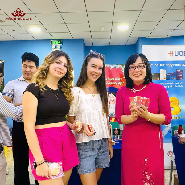Một trong những khoảnh khắc đáng nhớ là khi chị trò chuyện với các du học sinh Pháp. Họ chăm chú lắng nghe về nguồn gốc hoàng tộc, thành phần thiên nhiên lành tính, công dụng và cách sử dụng của phấn nụ. Thậm chí, có bạn còn tò mò hỏi: