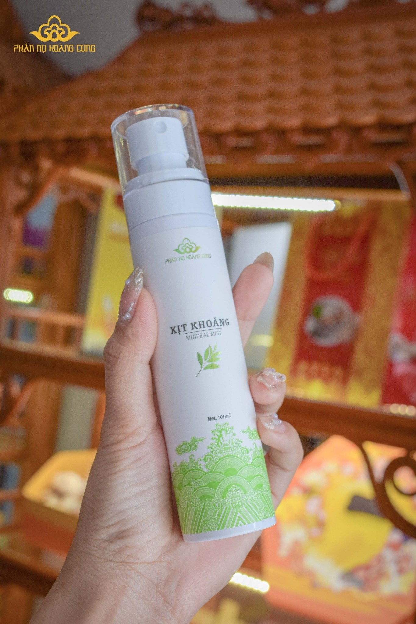 Xịt khoáng trà xanh - Phấn Nụ Hoàng Cung được chiết xuất từ thành phần dược liệu thiên nhiên cùng với công thức làm đẹp bí truyền của các mỹ nhân hoàng cung đình Huế.