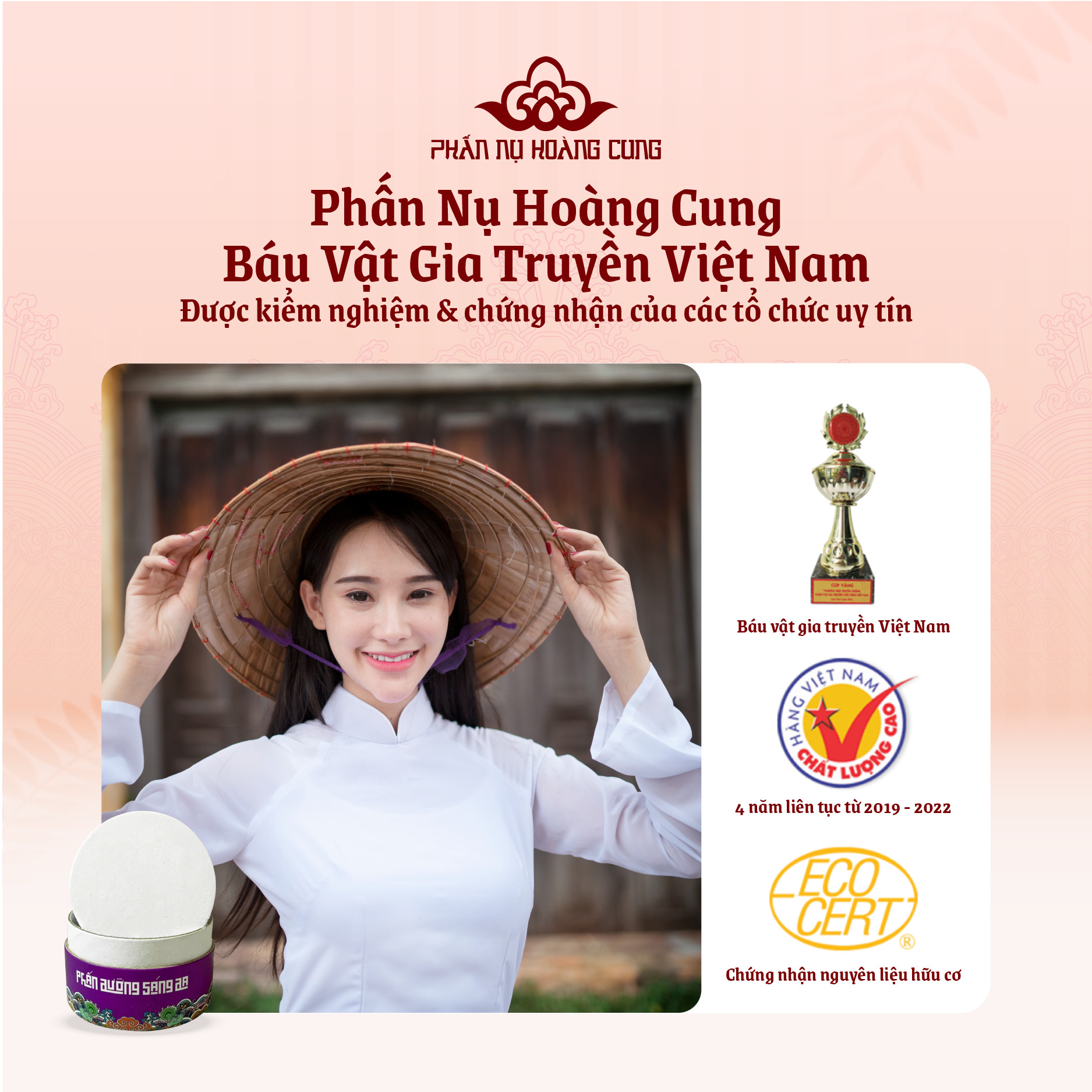 Phấn Nụ Hoàng Cung nổi bật với các sản phẩm có nguồn gốc độc đáo, công thức bí truyền, thành phần thiên nhiên an toàn và hiệu quả làm đẹp vượt trội đã được kiểm chứng qua hàng trăm năm lịch sử… Tự hào là một dòng mỹ phẩm truyền thống của người Việt, Phấn Nụ Hoàng Cung là thương hiệu duy nhất vinh dự sở hữu 2 chứng nhận cao quý: Thương hiệu nghề truyền thống và Báu vật gia truyền Việt Nam & Hàng VN chất lượng cao.