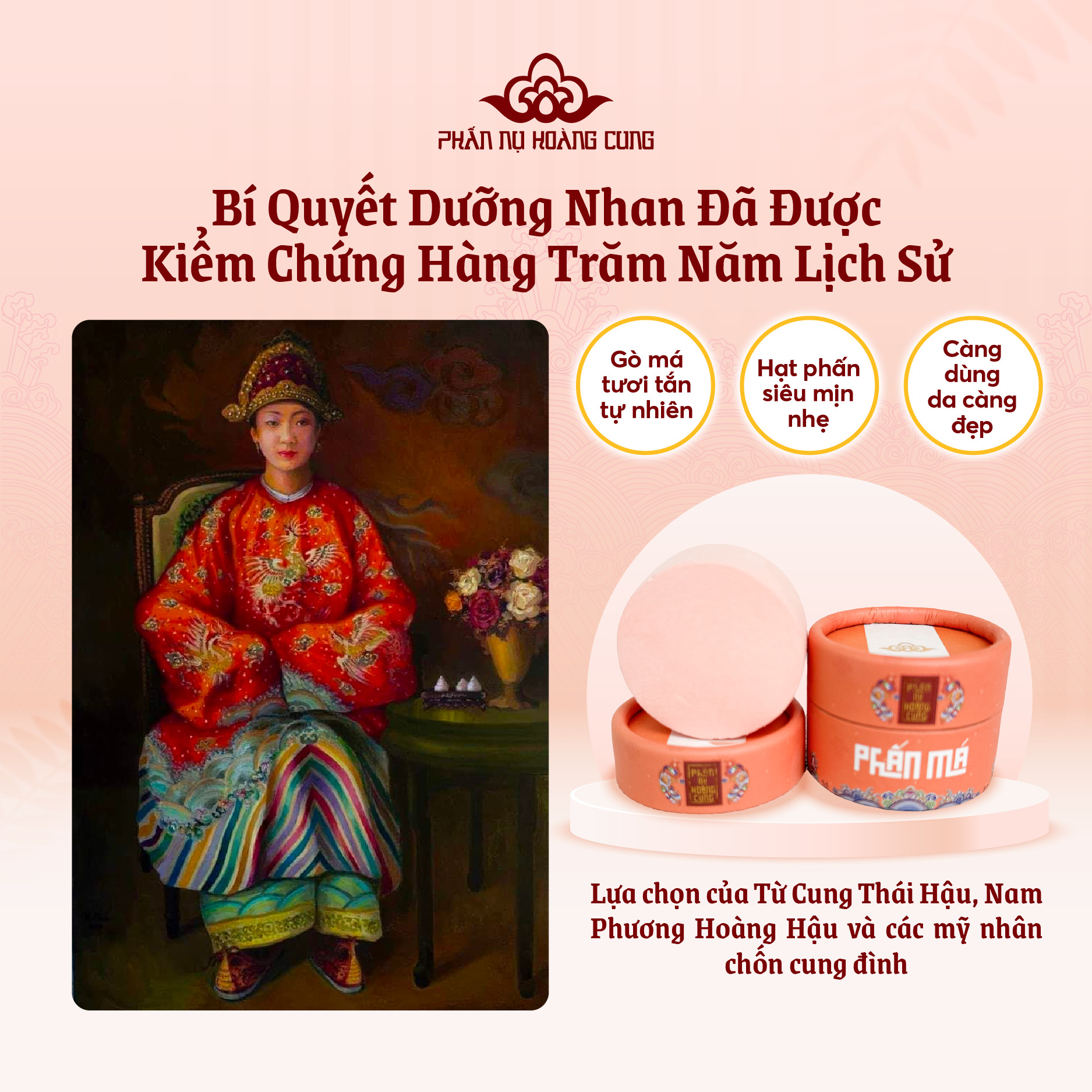 Kế thừa công thức bí truyền của các ngự y triều Nguyễn, lưu giữ nét thanh xuân của các mỹ nhân hoàng tộc chốn cung đình, hiệu quả Phấn Má Cam - Phấn Nụ Hoàng Cung đã được kiểm chứng qua hàng trăm năm lịch sử và được phụ nữ Việt ngày nay ưa chuộng với các công dụng nổi bật: